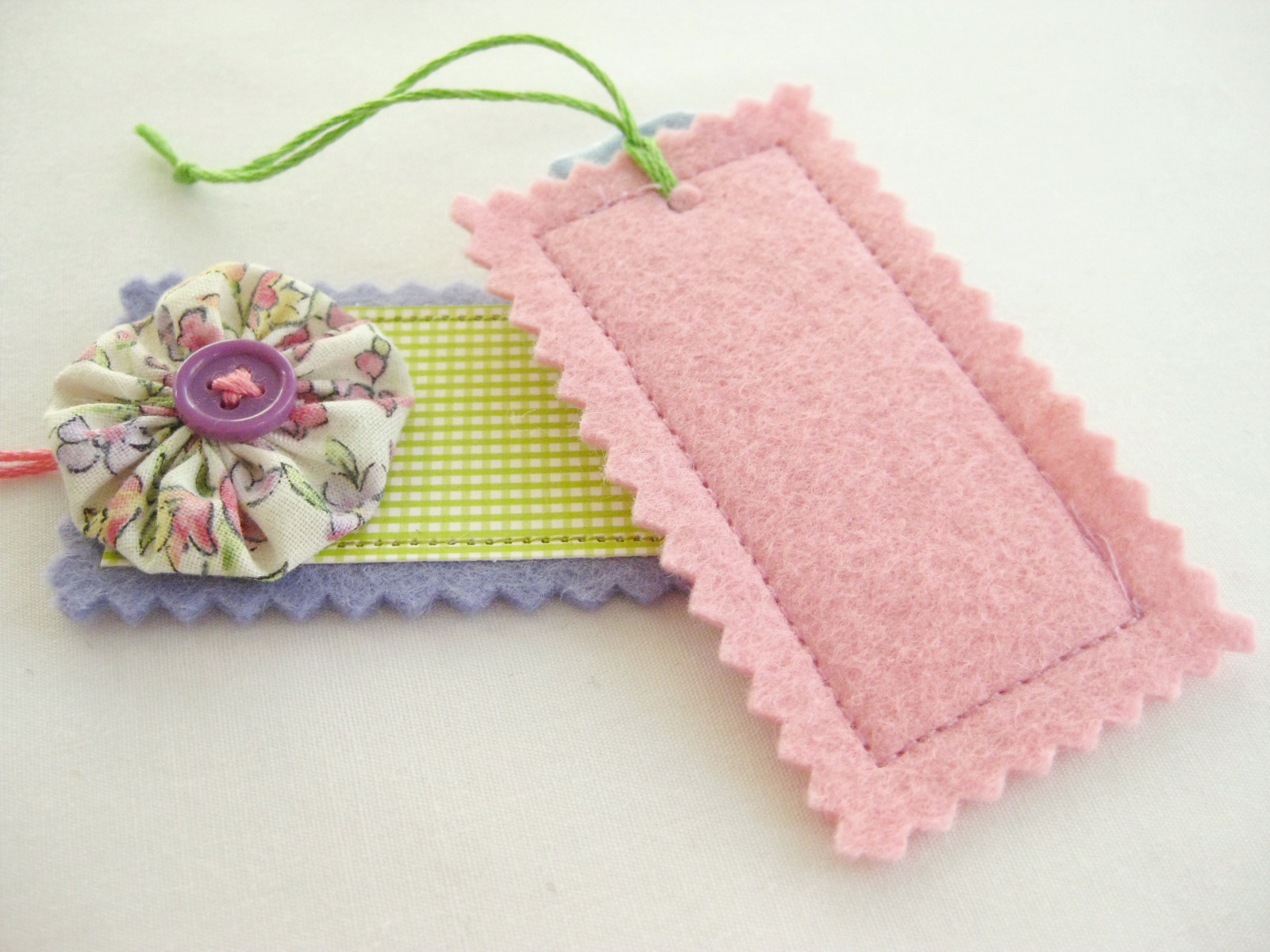 They really weren't much of a craetive revolution. In fact, they're almost identical to some nametags I once made up only instead of sewing a pin backing to the underside I punched a hole along the edge and looped a string through it to hang them by.